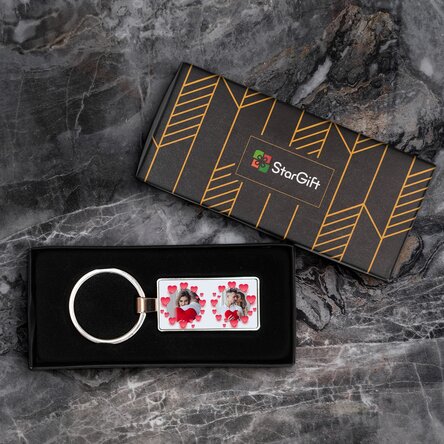 Ce pot personaliza? Brelocul poate fi personalizat cu două poze și text