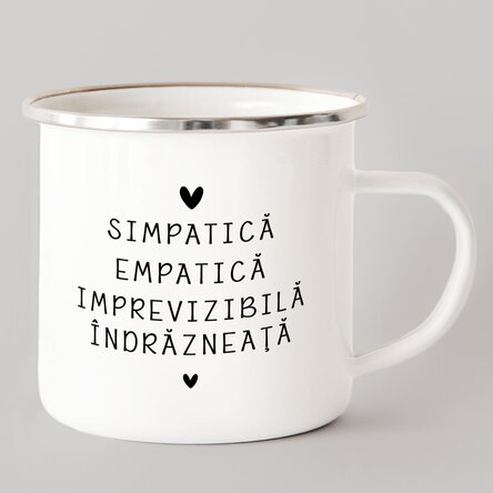 Notă: Cănile emailate sunt căni cu design vintage de la producător. Asta înseamnă că pot conține mici imperfecțiuni / puncte negre / zone mici cu smalț sărit. Aceste aspecte nu sunt considerate defecte de fabricație.