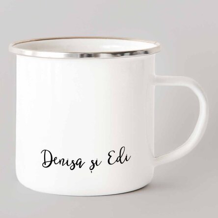 Cană metalică emailată personalizată cu poza și text - Model inimă