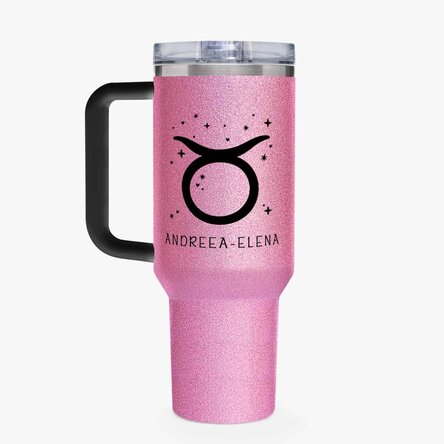 Cană termos cu mâner și pai personalizată cu mesaj - Zodia Taur