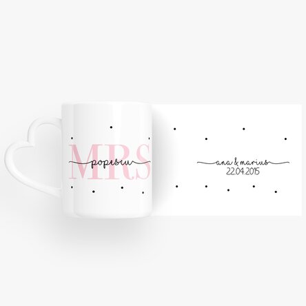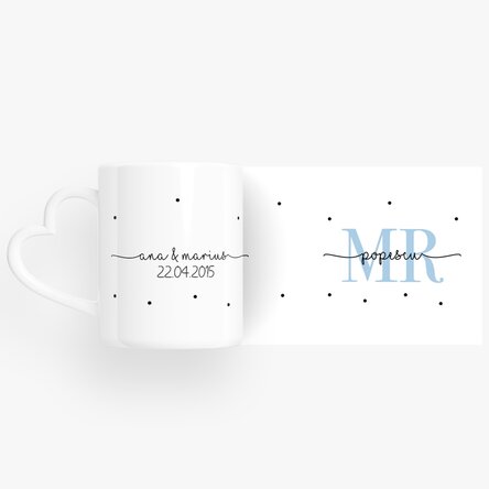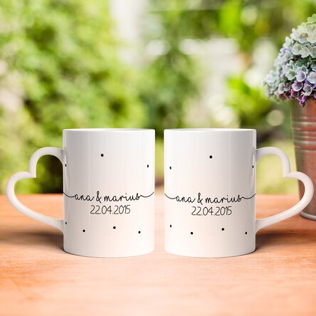 Cani pentru cuplu personalizate cu text și dată - MRS & MR - model toartă în formă de inimă