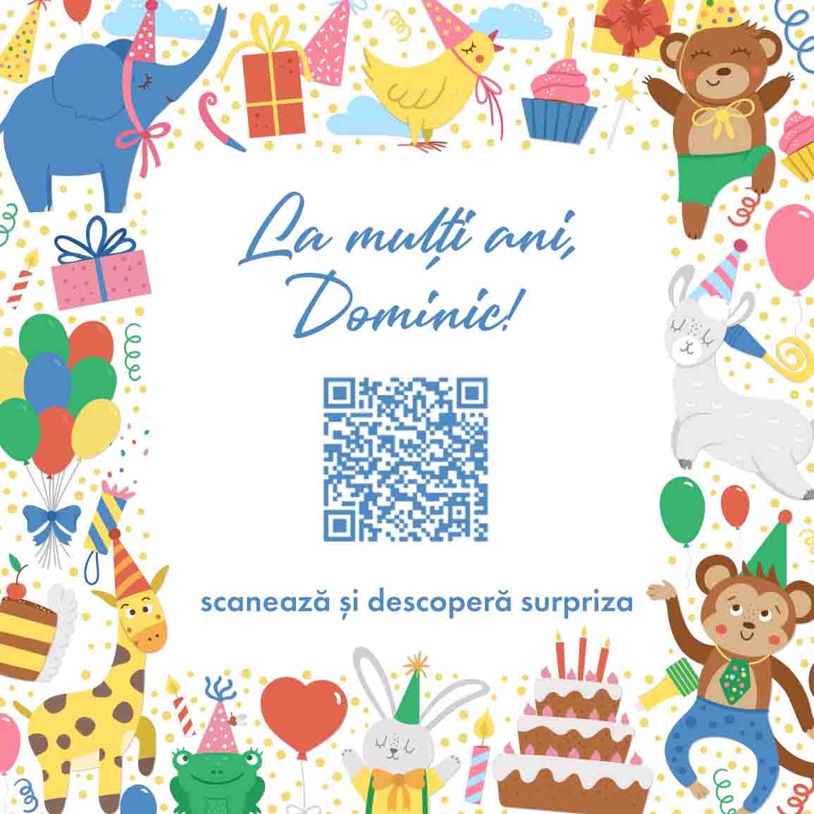 Un mod original și modern de a transmite un mesaj copiilor sau de a crea o amintire unică! Cardul pătrat poate fi personalizat cu textul dorit (nume, mesaj scurt, urare) și un cod QR care ascunde o surpriză: o melodie preferată, un videoclip, o galerie foto sau chiar un mesaj audio înregistrat special. Ce pot personaliza? Cardul poate fi personalizat cu text și cod QR.