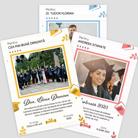 Cadourile pentru cei care ne învață din tainele vieții și ale învățăturii, fie că este diriginte, profesor sau învățător ori învățătoare, trebuie să fie la fel de importante pe cât de mult au reușit să ne îndrume cu pașii, mai mici sau mai mari spre viață. Acum ești gata să îți faci cu adevărat mândru și fericit un profesor sau profesoară, pe care îl/o admiri foarte mult și să îi lași amintire pentru mult timp de acum încolo, un mesaj special dedicat pe un cadou pe care îl va pune la loc de cinste. Ce pot personaliza? Cardul poate fi personalizat cu text și poză.