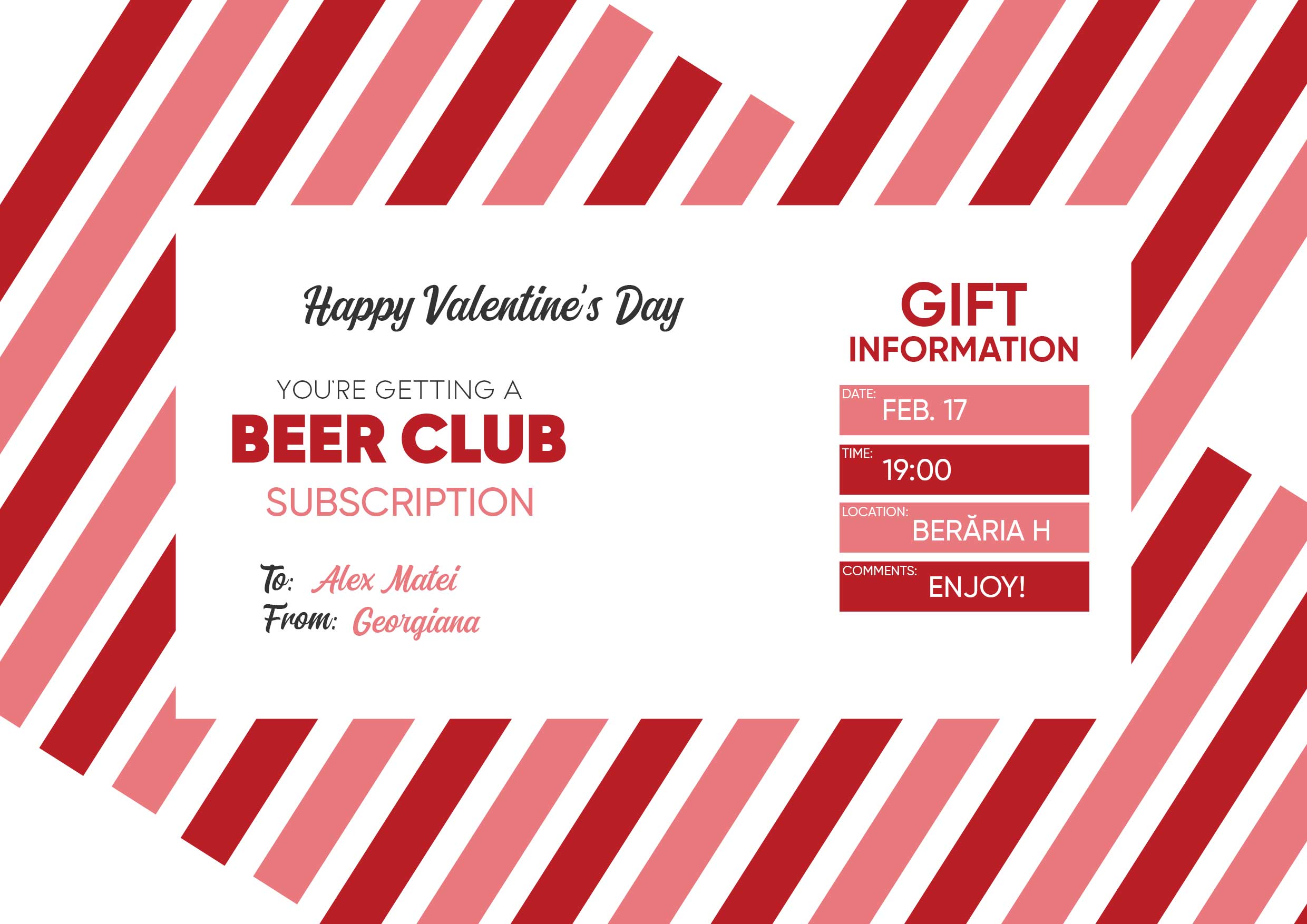 Potrivită pentru cupluri care știu că romantismul nu trebuie să fie complicat, acest voucher creează amintiri faine, nu doar momente siropoase. Un gest mic, dar cu gust excelent – pentru o zi de Valentine’s Day savurată până la ultima picătură Cum pot face personalizarea? Pasul 1: Apasă pe butonul "Personalizare" Pasul 2: Fă click pe textul exemplu și editează mesajul de personalizat. Pasul 3: Cum ai terminat personalizările, apasă butonul "Finalizare”, alege formatul produsului și adaugă produsul în coș.