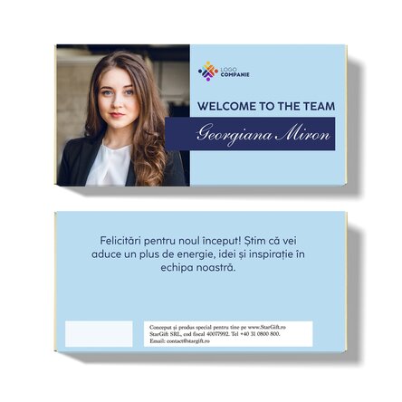 O surpriză dulce pentru noii colegi. Ciocolata personalizată cu logo-ul companiei și mesajul „Welcome to the team” este modul ideal de a-i face pe noii angajați să se simtă apreciați chiar din prima zi. Ambalajul personalizat cu identitatea vizuală a brandului tău și un mesaj prietenos, transformă acest gest simplu într-o experiență memorabilă.