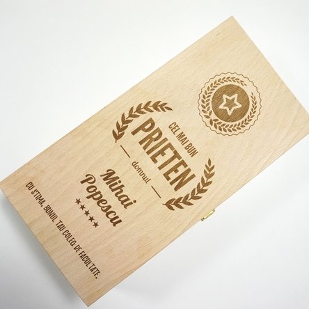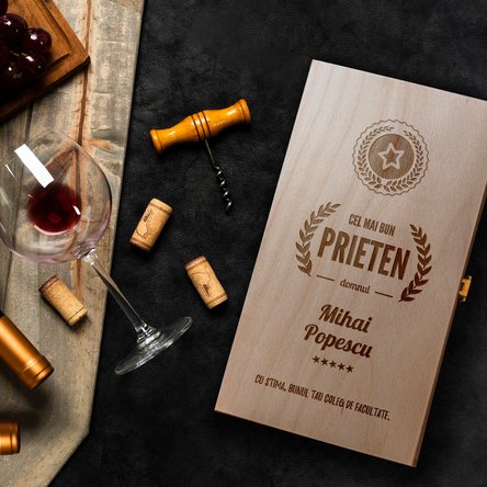 Un cadou cu adevărat inedit este cel care spune o poveste. Un obiect neînsuflețit, oricât de frumos, scump sau util, va fi tratat ca orice alt obiect din casă, însă un cadou cu suflet va fi mereu o amintire plăcută a celui care l-a oferit. Așadar, următorul cadou va fi cu adevărat special, pentru că noi, cei de la StarGift, îți prezentăm...cutia de vin personalizată, gravată pe lemn, ce poate fi ușor accesorizată cu două sticle de vin.