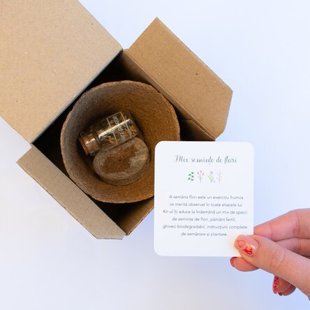 Conținut kit: 1 ghiveci biodegradabil, 2 pastile de pământ comprimat, 1 sticluță tip eprubetă cu semințe mix de specii de flori (Flori de Piară, Crăițe, Cavaleri, Flori de Nu mă Uita, Gura Leului, Margarete, Mac), instrucțiuni complete de semănare și îngrijire plante.