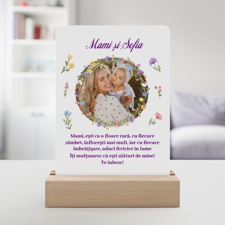 Blândă ca o briză a mării, frumoasă ca o primăvară, suavă ca un ghiocel și darnică, așa ne este mama. Prima noastră iubire, primul nostru prieten, prima noastră alinare. Ar fi putut exista un prim cuvânt mai frumos decât Mama? Pentru fiecare dintre noi, mama este cea mai importantă. Să îi aducem zâmbetul pe buze ori de câte ori avem ocazia, pentru că merită atât de multe. Ce pot personaliza? Lampa poate fi personalizată cu o poză și mesaj