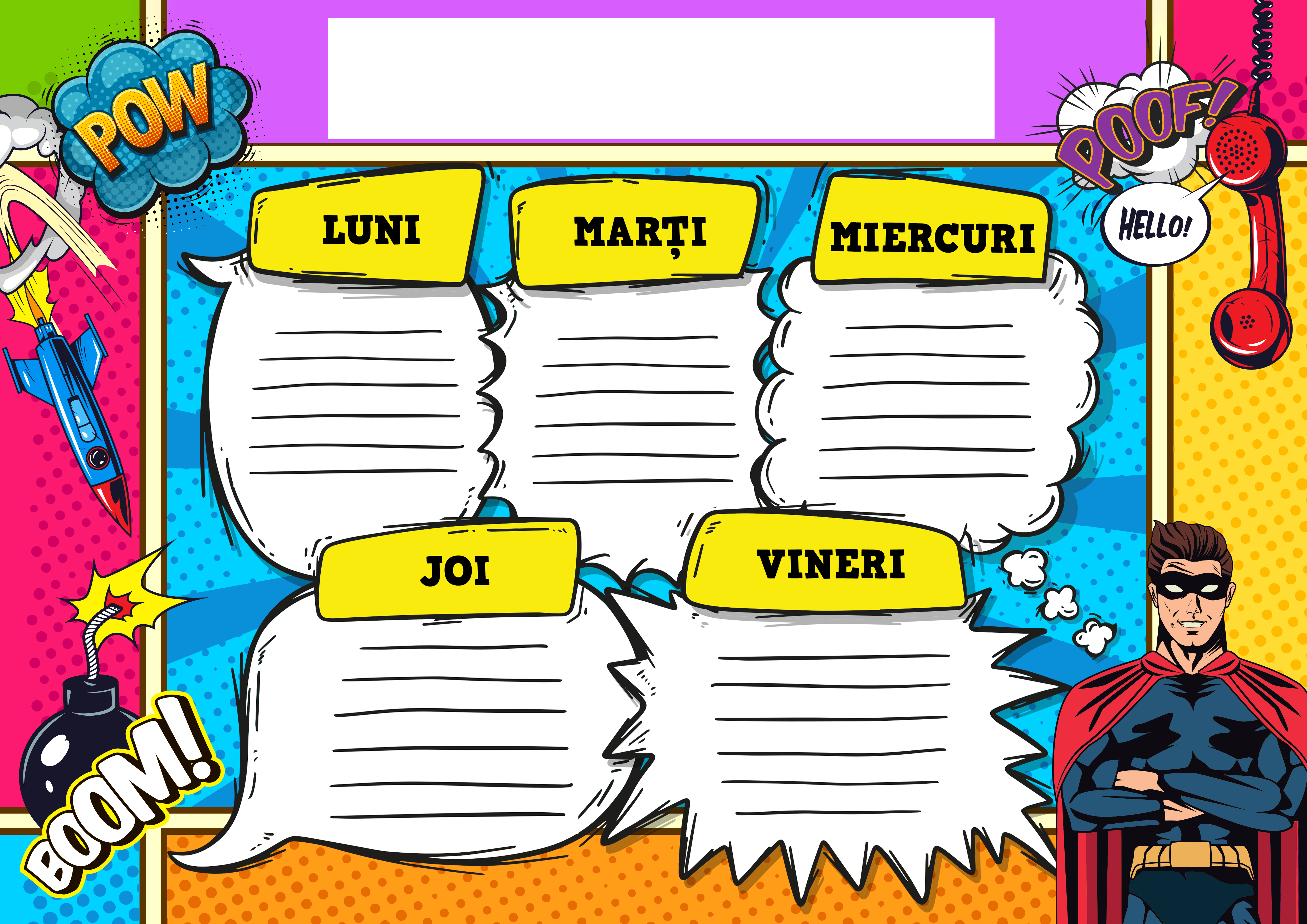 Transformă începutul de an școlar într-o experiență plină de culoare și energie cu orarul personalizat – Comic Books. Inspirat din stilul benzilor desenate, acest orar aduce un design jucăuș, cu ilustrații dinamice și culori vibrante, care îi vor face pe cei mici să aștepte cu entuziasm fiecare zi de școală.