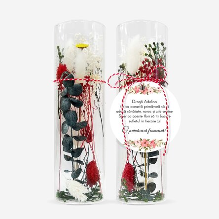Ornament mărțișor din sticlă cu flori prezervate personalizat cu mesaj