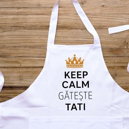 De exemplu, poți folosi clasicul „Keep calm” sau poți înlocui formula cu „șezi blând” sau „stai calm”, sau orice altă formulare inspirată îți vine în minte. De asemenea poți personaliza cu numele destinatarului: “Keep calm Andrei gătește” sau poți opta pentru cei care sunt mai putini calmi în bucătărie “i can’t keep calm Andrei gătește”. Exista o varietate multipla, depinde ce i se potrivește mai mult personalității persoanei care primește miraculosul sorț