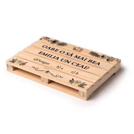 Îți prezentăm suportul de pahare care îmbină practicitatea cu umorul: un mini palet din lemn, perfect pentru băuturile de toate formele și mărimile! Inspirat de iconicii paleți din depozite, acest suport unic este creat pentru oricine se bucură de o băutură rece și de o glumă bună. Chiar deasupra, apare întrebarea clasică: „oare să mai beau o bere?” – însă poți modifica mesajul pentru a se potrivi mai bine. Mai jos, ca într-un test școlar, vei găsi trei opțiuni de răspuns: a) Desigur; b)a și c)b.